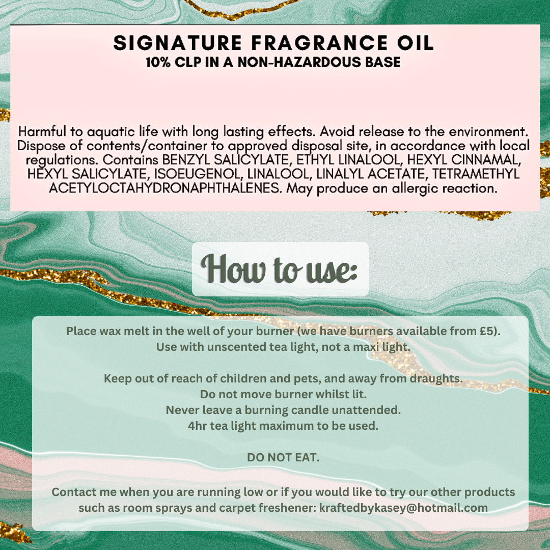 Full list of CLPs available on the Fragrance Oil CLP & Dupe Info page on this website. Individual wax melt bars will also have their CLP uploaded as an image. Please do not mix different scents of wax melts as this invalidates the CLP label.