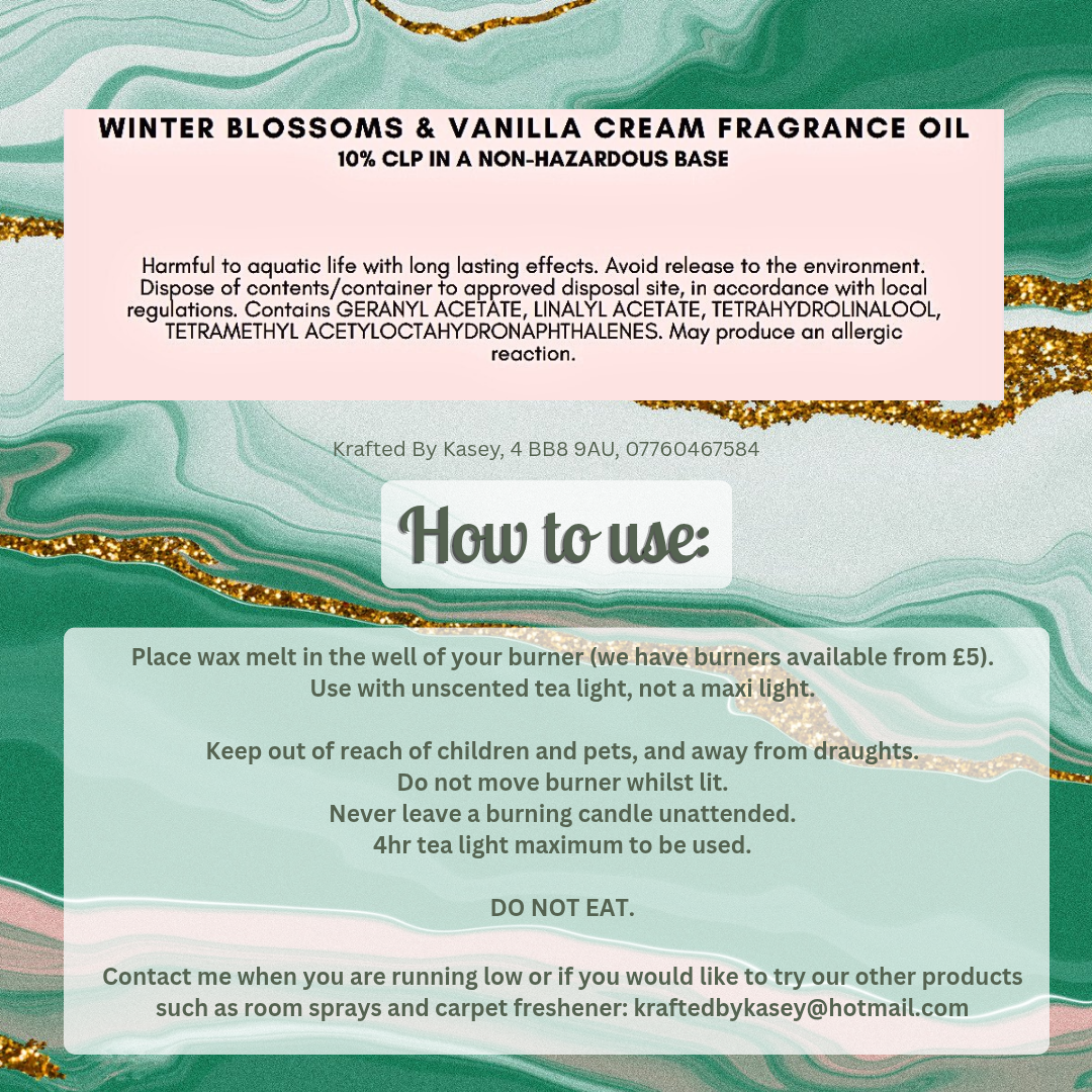 Full list of CLPs available on the Fragrance Oil CLP & Dupe Info page on this website. Individual wax melt bars will also have their CLP uploaded as an image. Please do not mix different scents of wax melts as this invalidates the CLP label.